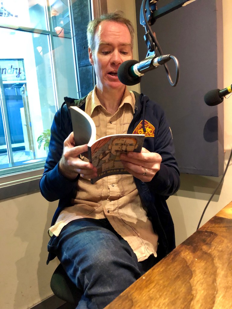 The station is located off East Hastings Street in Vancouver, in a devastated part of the city. In response to my walk to the station, I started by reading him the cruelest poem in my book of cruel poems: “The Problem With Love.” He compared the poems of my book to the “goons” on the 1970’s Philadelphia Flyers, and also their present mascot, Gritty, all of which I took as the greatest compliment imaginable. This led to a conversation about surrealism, involving David Lynch, Cocteau, Gordard, Donald Barthelme, and Mary Ruefle.